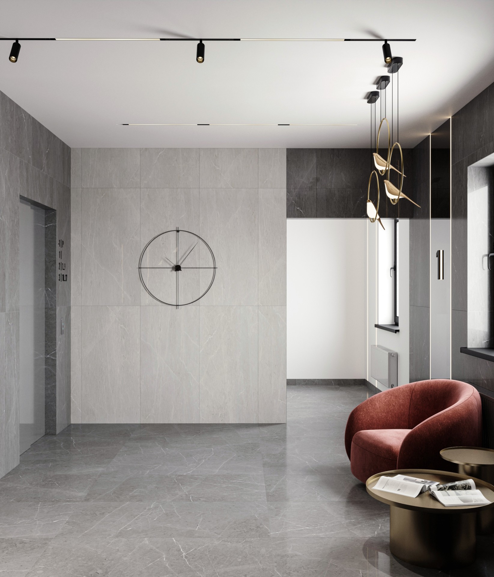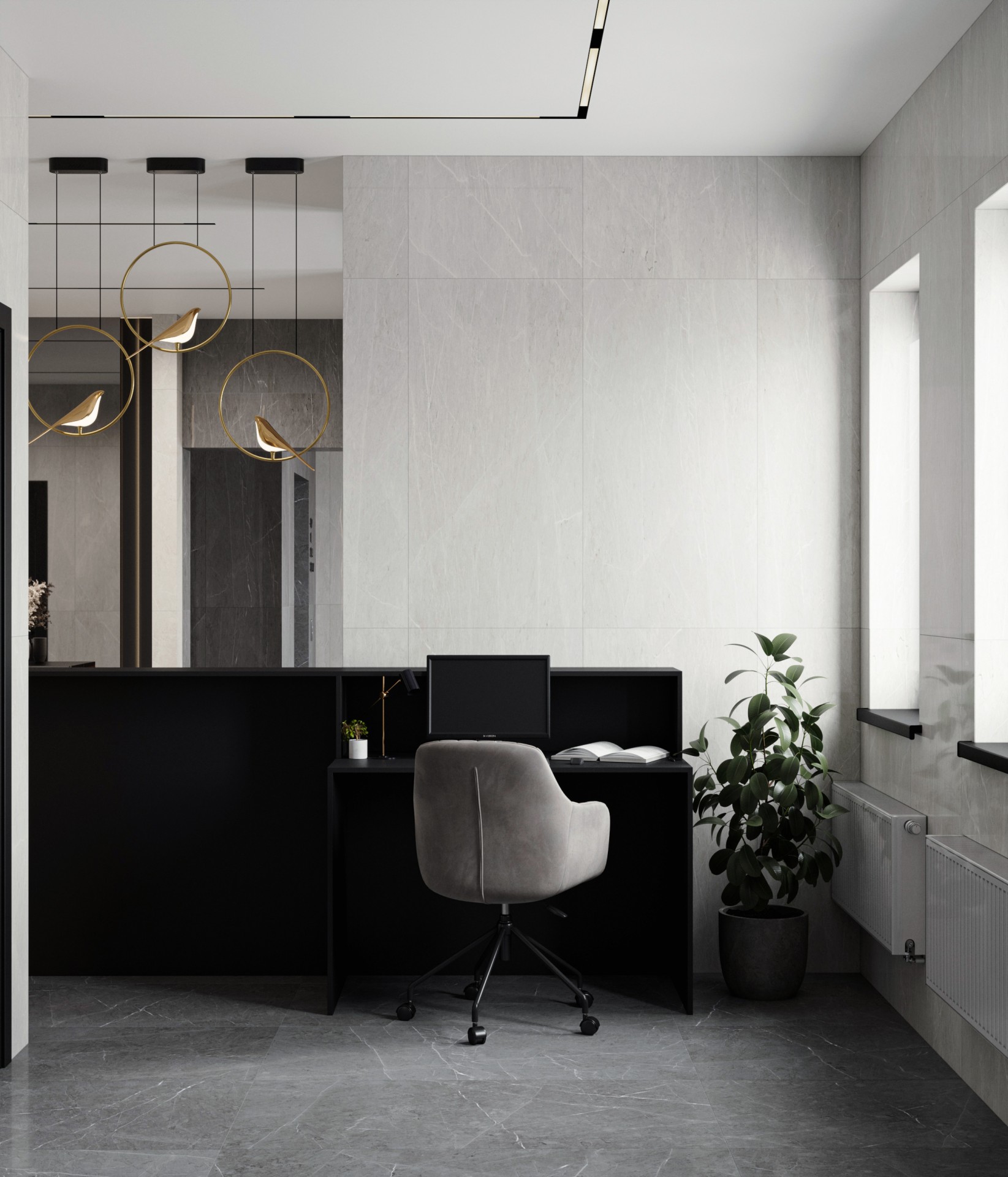 Особое внимание уделено зоне ресепшена, где установлены уникальные светильники в виде птиц. Они не только обеспечивают необходимое освещение, но и служат стильным декоративным элементом, добавляющим пространству легкости и элегантности. Этот элемент подчеркивает индивидуальность проекта и создает приятное первое впечатление.