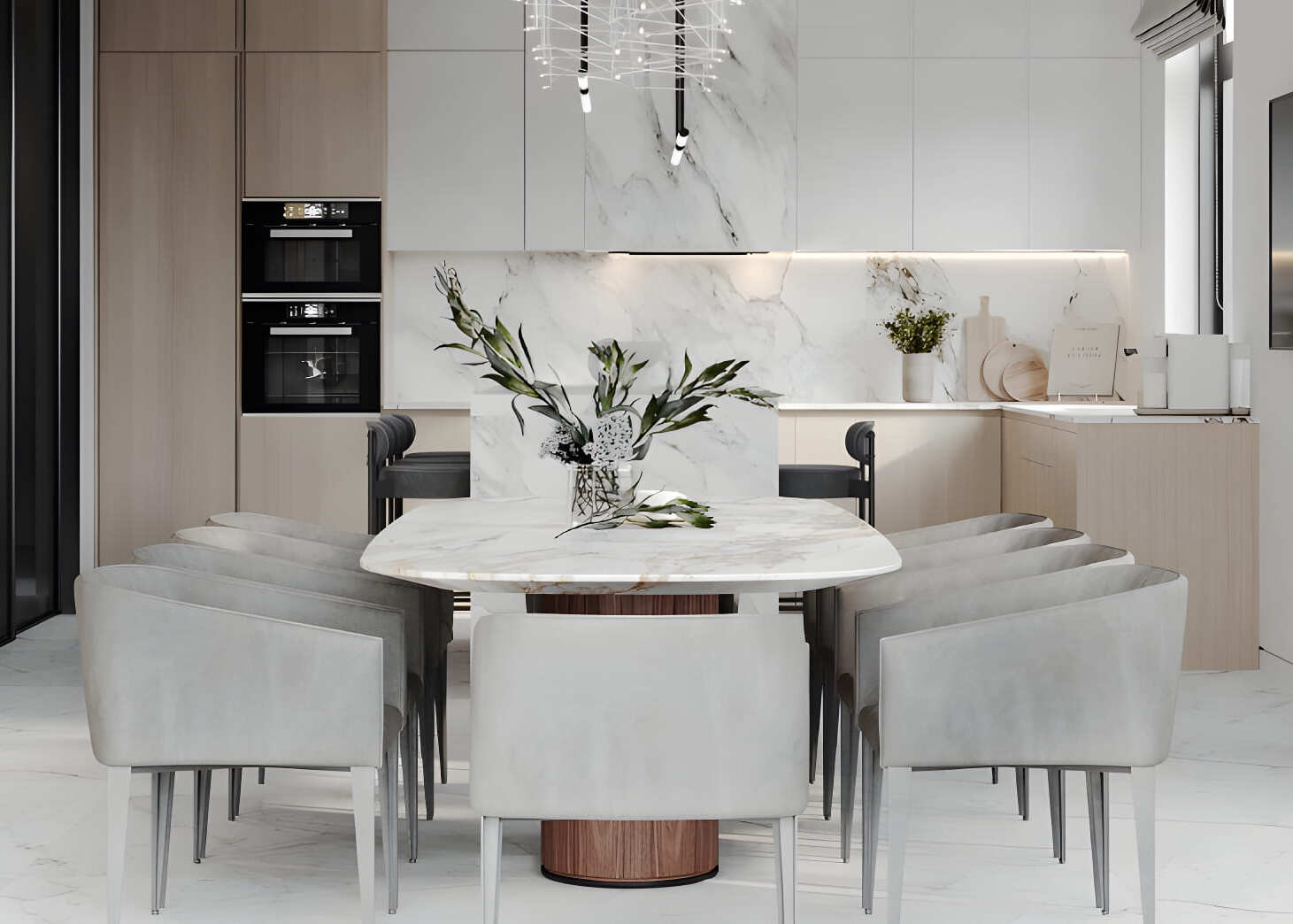 В главной комнате, в гостиной, мы предусмотрели открытие штор и рулонных штор на электрокарнизе. В центре помещения располагается большой модульный диван и ТВ. ТВ-зону решили интересно обыграть 3D панелями со встроенной подсветкой.