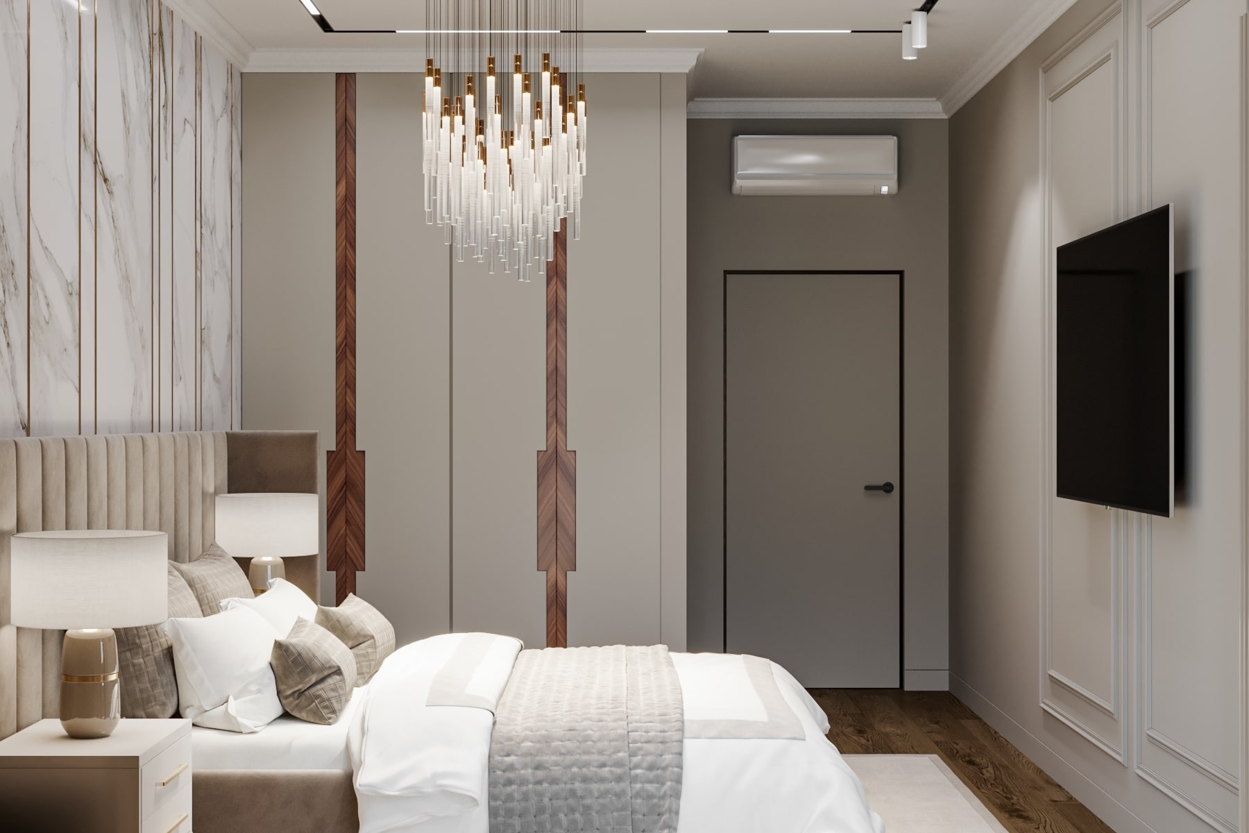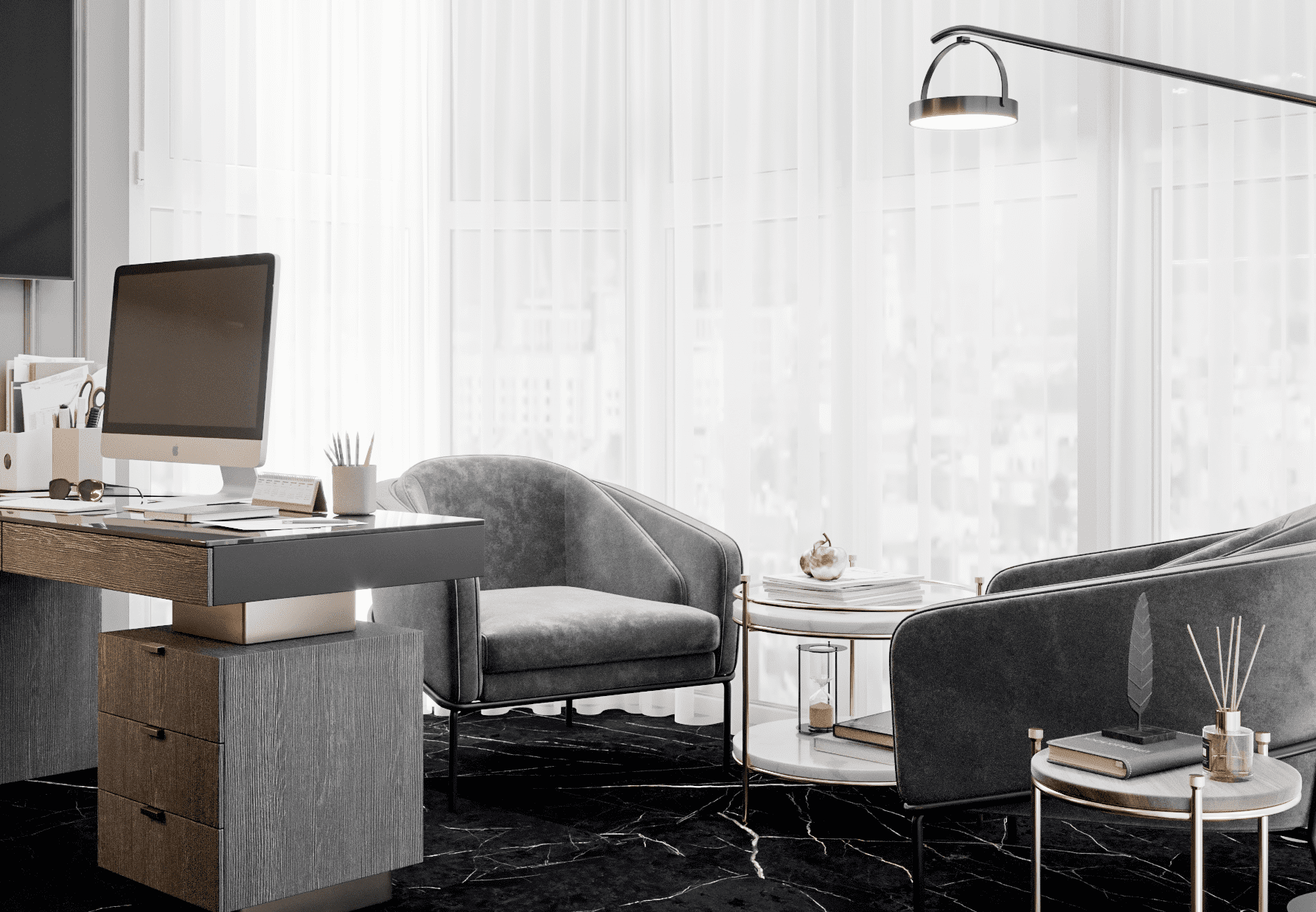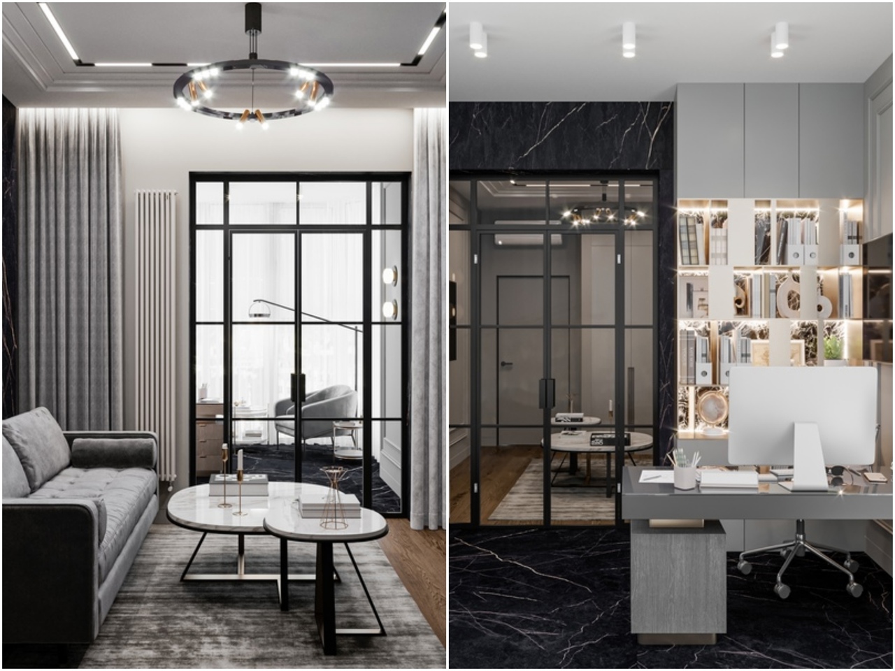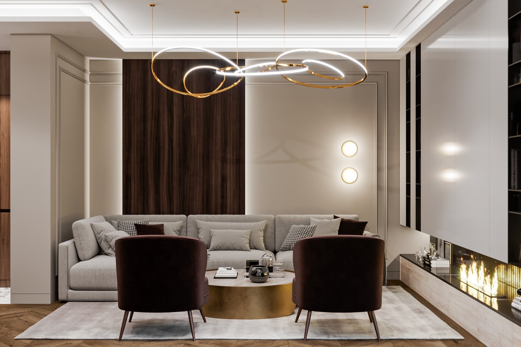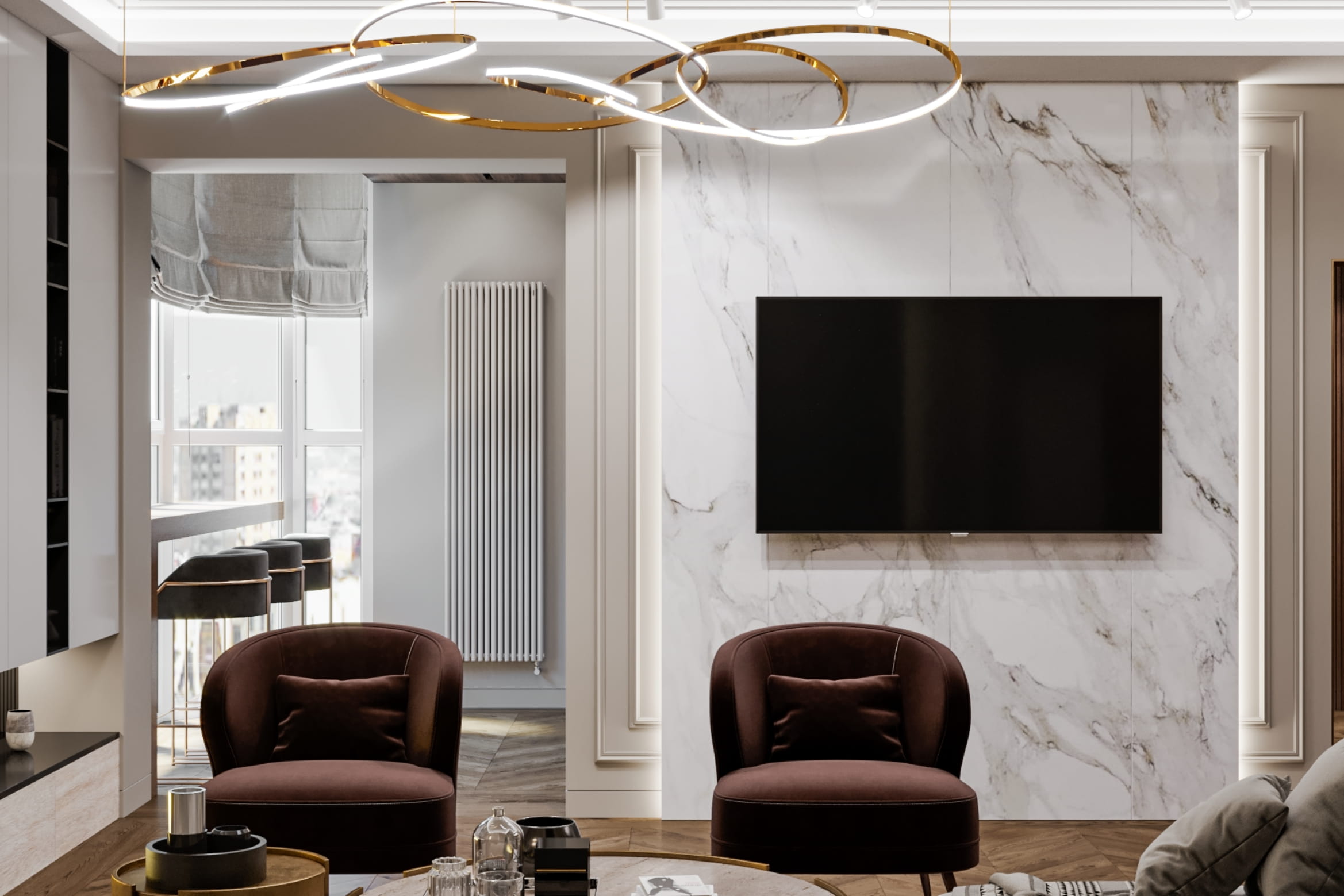Помещения, выполненные в стиле арт-деко, смотрятся богато и эклектично. Простор и роскошь в каждой детали. Самый подходящий материал как для отделки стен, так и для напольного покрытия - натуральный камень. В нашем случае это мрамор. Для создания уюта мы установили камин, мягкие кресла и диван.