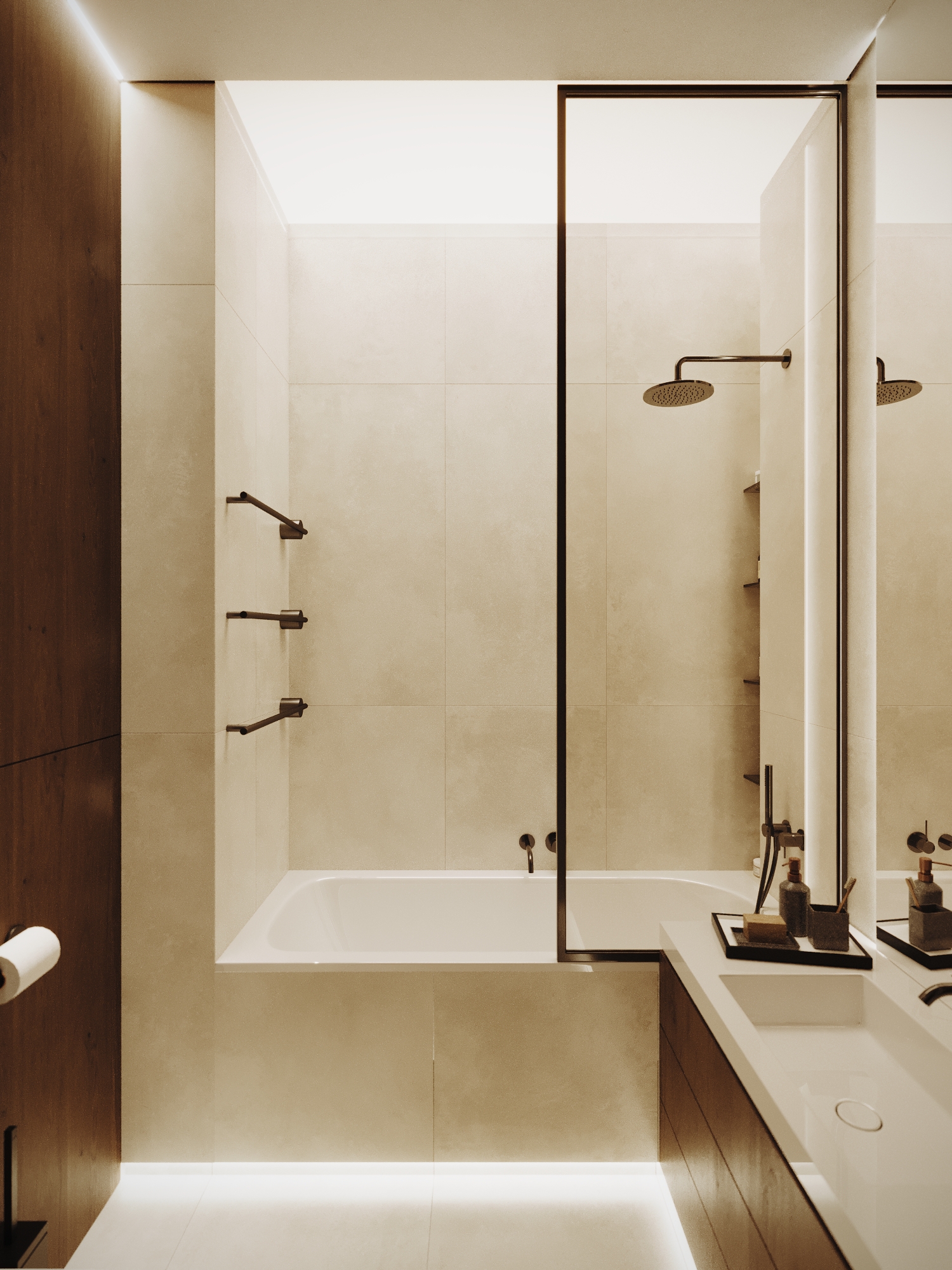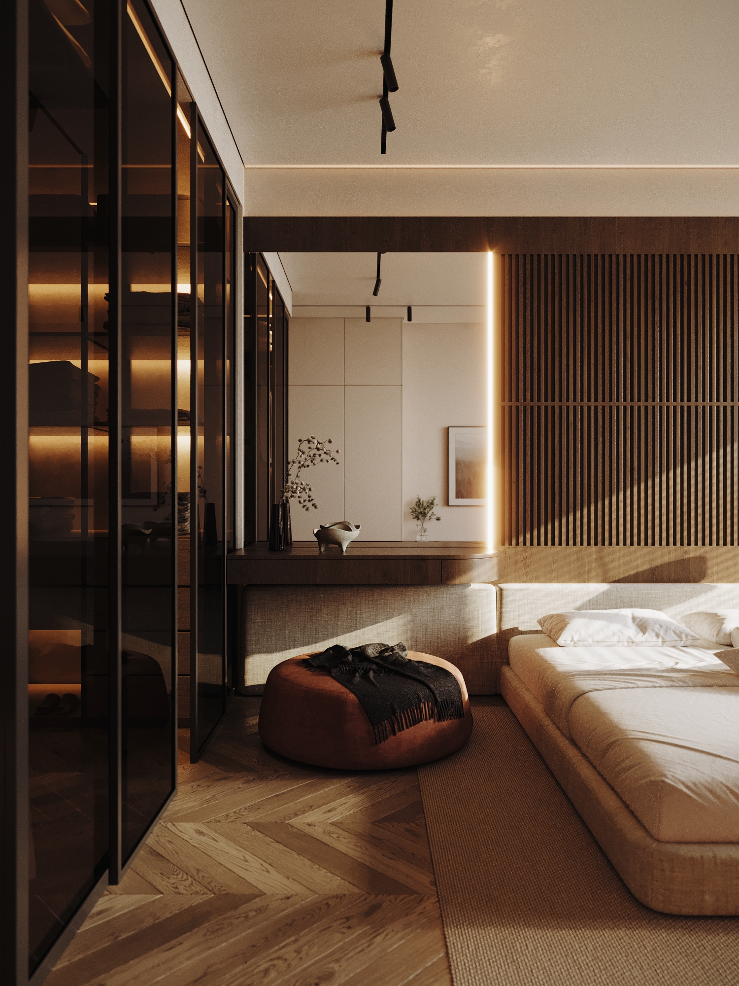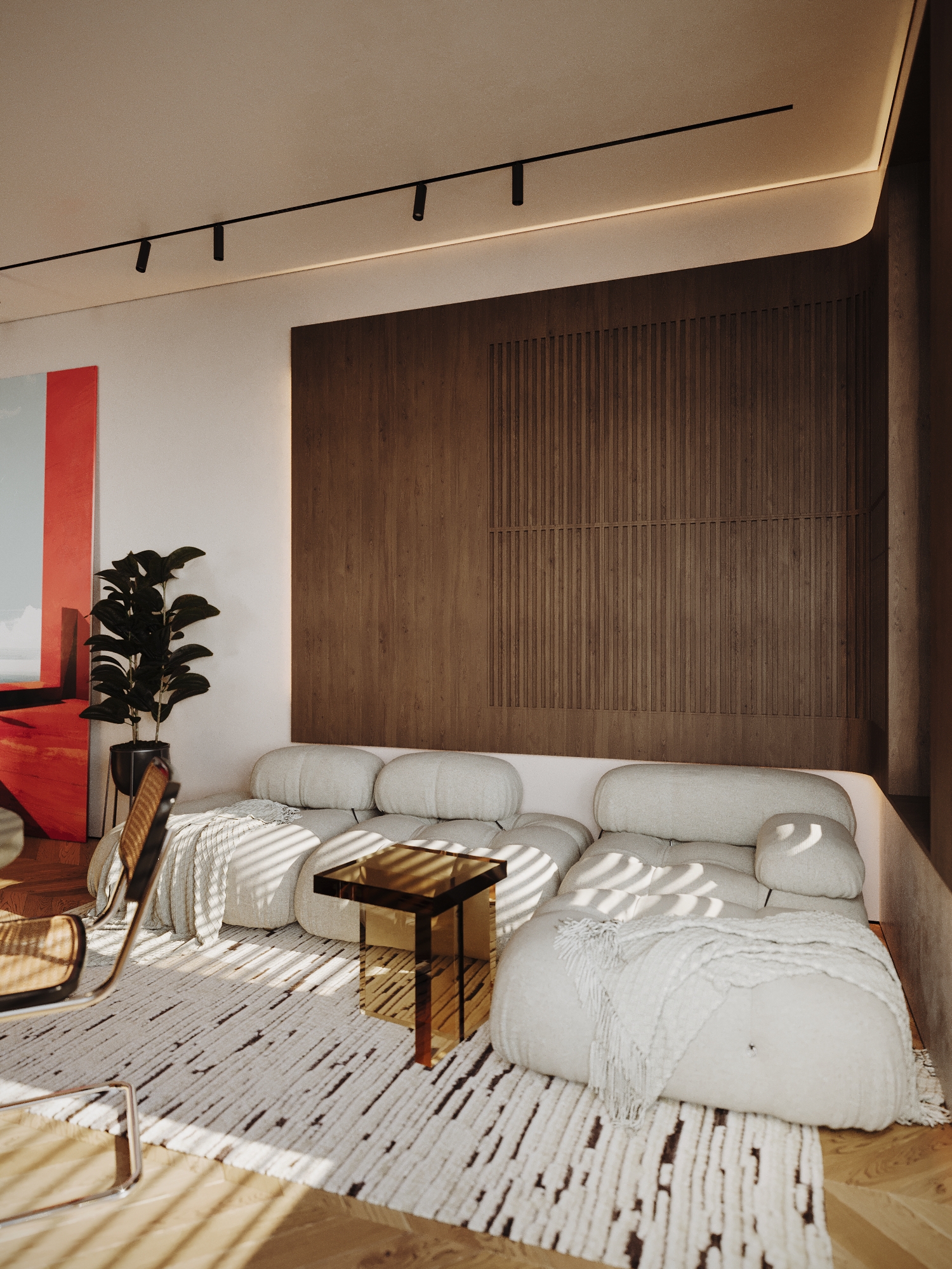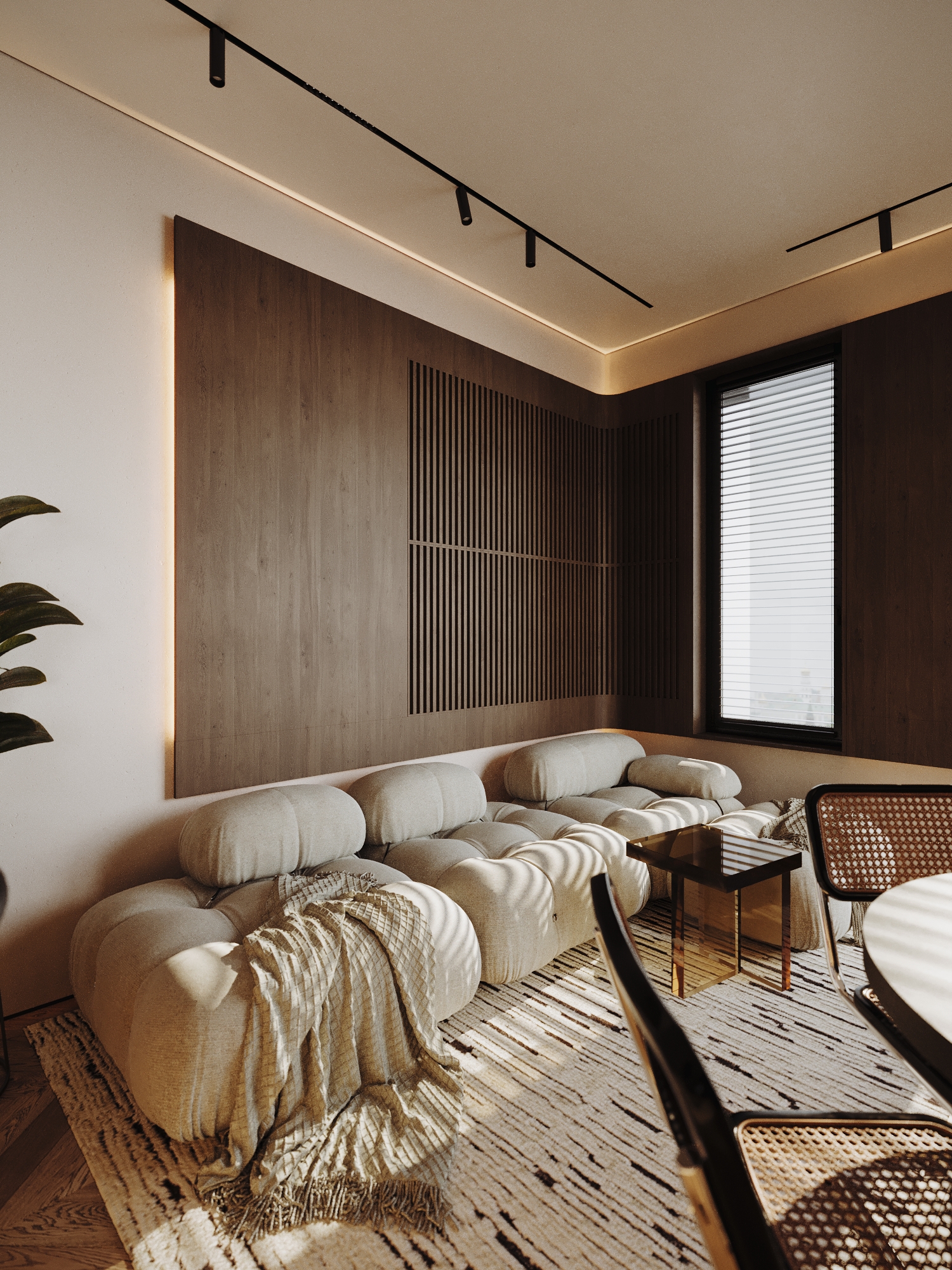 В гостевой зоне расположен мягкий диван с округлыми формами в бежево-песочной обивке. Он создаёт уютный акцент на фоне строгих линий мебели. Стены украшены деревянными рейчатыми панелями и крупноформатной картиной с тёплым графичным сюжетом, придающей интерьеру индивидуальность и эмоциональную глубину.